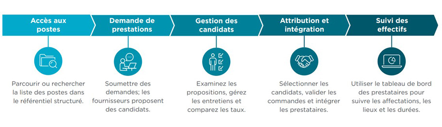 Bénéficiez d’un processus de recrutement personnalisé, incluant des entretiens adaptés, et recevez des propositions de candidats sur mesure de la part de vos fournisseurs. Profitez également d’une gestion transparente, de la création de commandes de prestataires jusqu’au suivi complet du cycle de vie des ressources externes.